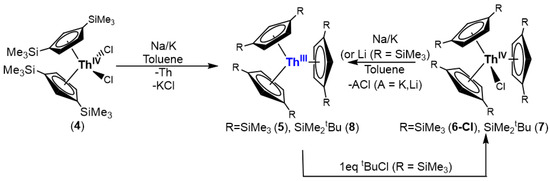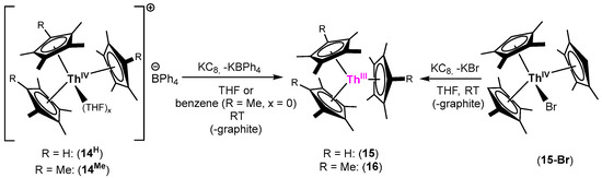 Using the electron donating [CpMe4]− and [Cp*]−, Evans and co-workers were able to synthesise the homoleptic purple Th(III) complexes [(η5-CpMe4)3Th] (15) [25] and [(η5-Cp*)3Th] (16) [26] respectively, by reducing the Th(IV) precursors [(η5-CpMe4R)3Th(THF)x]BPh4 (R = H: x = 0 (14H); R = Me, x = 0, 1 (14Me)) with KC8 or in the case of (15) by reducing [(η5-CpMe4)3ThBr] (15-Br), using the same reductant (Scheme 4).