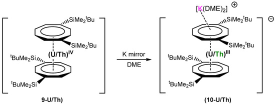 Following the seminal synthesis of Th(III) complexes (5) and (8), Cloke and co-workers reported on the synthesis of the green–blue ionic Th(III) sandwich complex [K(DME)2][Th(η8-COTTBDMS2)2] (10-Th) (COTTBDMS2 = [{1,4-(SiMe2tBu)}2-C8H6]2−; DME = 1,2-dimethoxyethane) from the reduction in the neutral Th(IV) precursor [Th(η8-COTTBDMS2)2] (9-Th) with K mirror in DME (Scheme 2) [22]. In a similar manner, the ionic U(III) congener (10-U) was also isolated, and a structural comparison between these two An(III) complexes revealed that the Th(III) metal radius in (10-Th) is approximately 0.04 Å larger than U(III) in (10-U) (0.06 Å larger than in Th(IV) complex (10-Th)). Again, EPR studies in powdered samples of (10-Th) at 298 K and 110 K revealed a 6d1 electronic configuration with the unpaired electron residing in a SOMO of predominantly dz2 character.