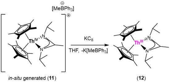 In 2010, Evans et al. reported the synthesis and structural characterisation of the dark purple Th(III) [(η5-Cp*)2Th(κ2-iPrNC(Me)NiPr] (Cp* = CpMe5) (12) from the reduction of in situ generated [(η5-Cp*)2Th(κ2-iPrNC(Me)NiPr)]+[MeBPh3]− (11) with KC8 in THF (Scheme 3) [23]. Based on UV-Vis, EPR and DFT studies, this complex also adopts a 6d1 ground-state electron configuration. The Th-Cp* centroid distances shorten from 2.584 and 2.598 Å in precursor (11) to 2.541 and 2.545 Å in (12), despite Th(IV)’s smaller ionic radius. Concurrent to this is the shortening of the Th–N bond distances in (12) compared to the Th(IV) complex [(η5-Cp*)2Th(κ2-iPrNC(Me)NiPr)Me] (13) [24] and the authors attribute this phenomenon to relieving steric hindrance upon removal of the Me ligand.