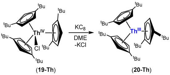 Using the bulky and electron-rich Cptt− (Cptt− = [1,3-tBu2-C5H3]−) ligand, Mills and co-workers were able to isolate dark blue [(η5-Cptt)3ThIII] (20-Th) from the reduction in its Th(IV) precursor [(η5-Cptt)3ThCl] (19-Th) with KC8 in DME (Scheme 5) [28]. Detailed CW and pulsed EPR (HYSCORE) studies on (20-Th) and its U(III) congener (20-U) revealed that there is a greater degree of covalency between the ligand and the U3+ centre in (20-U) than in (20-U) despite the greater radial extent of 6d orbitals vs 5f. This was attributed to only the singly occupied 6dz21 in (20-Th) having the correct orientation for the overlap of its annular lobe with ligand frontier orbitals, whereas in (20-U), the singly occupied 5f orbitals (5f3 electronic ground state) have a more in-plane character [28]. A more recent detailed theoretical and computational study from Chilton et al. [29], which takes into account paramagnetic spin–orbit contributions to model the experimental spectra, arrived at the conclusion that actually (20-Th) exhibits a higher degree of covalency between the Cptt ligands and the Th(III) centre; interestingly the interactions between the Th(III) centre and the ligand extend further from the carbons of the 5-membered Cptt scaffold to include the H atoms of the ring, while the tBu substituents are also involved. A comparison of 13C-HYSCORE spectra of (20-Th) and [YbIII(η5-Cp)3](2-Yb) (4f13) [30] surprisingly suggests similar covalency between the two, despite the 4f vs. 6d/5f valence orbitals.
