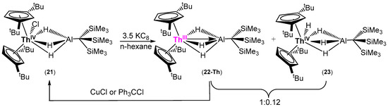 Reduction in the Th(IV) alanate complex [(η5-Cptt)3ThCl(μ-H)3AlC(SiMe3)3] (21) with excess KC8 in n-hexane furnished the purple Th(III) complex [(η5-Cptt)3Th(μ-H)3AlC(SiMe3)3] (22-Th) which co-crystallises with the Th(IV) hydride complex [(η5-Cptt)3ThH(μ-H)3AlC(SiMe3)3] (23) in a 1:0.12 ratio ((22-Th):(23)) (Scheme 6) [31]. Despite the presence of (23), the identity of (22Th) as a Th(III) complex was confirmed by magnetic studies, EPR and UV-Vis spectroscopy. The most interesting feature in (22Th) is the Th→Al bonding interaction (2.942(2) Å) originating from an overlap of the singly occupied 6dz2 in (22Th) and the antibonding Al-C molecular orbital of the alanate ligand, which has a predominantly Al-3p character. The U(III) analogue (22-U) also shows a similar interaction, with Wyberg Bond Indices for the U→Al interaction very similar to that of (22-Th), despite the involvement of 5f valence orbitals [31]. This novel bonding interaction was further scrutinised by DFT studies and later by pulsed EPR techniques, and was compared to the Ti(III) complex [Cp2Ti(μ-H)3AlC(SiMe3)3](22-Ti), which revealed that in the latter, the Ti→Al interaction is at best minimal due to the 3d orbitals of Ti (i.e., smaller radial extent) being much less diffuse [32].