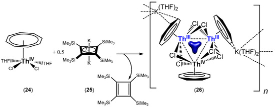 Liddle et al. reported that K2[C4(SiMe3)4] (25) acts as a reducing agent when it reacts with [(η8-C8H8)ThCl2(THF)2] (24), leading to the formation of the blue trimetallic thorium cluster [{Th(η8-C8H8)(μ3-Cl)2}3{K(THF)2}2]∞(26) (Scheme 7) [33]. This cluster features two Th(III) and one Th(IV) metal centres, and it is diamagnetic according to SQUID (Super Quantum Interference Device) measurements (albeit ~1.3% of an unidentified paramagnetic impurity was also present). The diamagnetism of (26) points to a d2 singlet ground state instead of two non-interacting magnetic singlets (i.e., two d1-d1 Th(III) metals centres), which were also supported by theoretical calculations. Computationally, it was found that a 3c-2e− HOMO between the three Th centres rationalised the observed magnetic measurements [33], and it was suggested that (26) exhibits σ-aromaticity [33,34,35]. This was challenged by Szczepanik [36], suggesting that a multi-centre charge-shift bonding between the Th and Cl atoms is dominant (i.e., delocalisation along the Th-Cl bridges). A very recent detailed study by Kaltsoyiannis et al. [35] scrutinising different basis sets and employing an extended NBO (Natural Bond Order) analysis (specifically Adaptive Natural Density Partitioning—AdNDP) showed that delocalized electrons are associated unsurprisingly with the COT ligands but also the Th3 centres. Indeed, the latter showed that the bonding contribution in the Th3 core resembles the Kohn–Sham HOMO calculated using the most appropriate SARC-TZVPP basis set from the ones scrutinised. Furthermore, calculations examining the responses of electron delocalisation in an applied magnetic field gave further evidence for the aromaticity of the Th3 core. Lin and Mo have also arrived at the conclusion that (26) displays such σ-aromaticity [34]. It is also worth pointing out that unlike the previous examples discussed above, the centres of the Th(III) metals in (26) encompass their coordination sphere, bridging chlorides as supporting ligands.