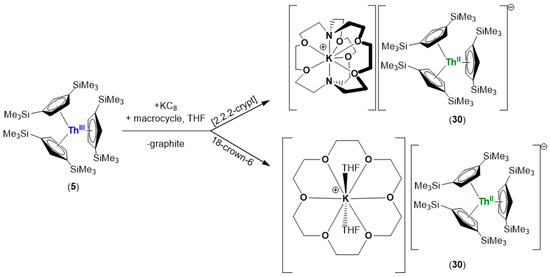The scarcity of Th(III) complexes is even more pronounced in the case of Th(II) complexes. The first evidence of the existence of Th(II) was reported by Lappert et al., when it was observed that during the synthesis of [Th(η5-Cp″)3] (5) using an excess of Na/K alloy, the reaction mixture turned from blue to green. An NMR spectroscopy revealed that this green compound was diamagnetic, but it could not be isolated and fully characterised. Following the landmark isolation of the first U(II) complex [K(2.2.2-crypt)][UII(η5-Cp′)3] (68′-U) (Cp′ = {C5H4-SiMe3}− see below Section 3.1.1) [38], Evans and co-workers tried to access the Th(II) complexes supported by the Cp′ ligand, but unfortunately these attempts were not successful [39]. Following this work, the reduction in (5) with a small excess of KC8 (ca 1.5 mol eq.) in the presence of [2.2.2.-crypt] or 18-crown-6 in THF yielded a green solution, from which the dichroic blue/red Th(II) complex [K(macrocycle)(THF)x]+[Th(η5-Cp″)3]− (30) (macrocycle [2.2.2-crypt], x = 0; macrocycle = 18-crown-6, x = 2) could be isolated (Scheme 9) [40]. The molecular structure of the anion in (30) shows that the Th(II) metal centre adopts a trigonal coordination mode similar to the Th(III) precursor (5). The Th-Cp″ (centroid) distances are essentially the same between the two compounds (avg 2.523 Å in (30) vs. 2.520 Å in (5)), signifying that the ground state electronic configuration in (30) is most likely 6d2. NMR spectroscopy, as well as magnetometric studies both in solution (Evan’s method) and in the solid state (SQUID) at RT and low temperatures, show that (30) is indeed diamagnetic, confirming Lappert’s initial observations. It has to be noted that DFT calculations in the gas phase point to a 5f16d1 ground electronic configuration while the experimentally-found 6d2 electronic configuration is only 63 cm−1 higher in energy; the HOMO in (30) has largely 6dz2 character.