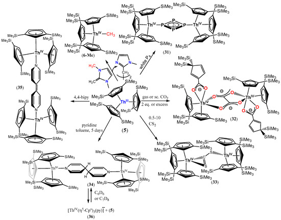 Surprisingly, it was more than three decades after (5) [18] was isolated that the reactivity of this seminal Th(III) complex was investigated. Complex (5) readily reacts with stoichiometric amounts (i.e., two equivalents) or excesses of CO2 (gas or supercritical) to give the Th(IV) dimer (32) (Scheme 10), which contains a bridging {μ-κ2:κ2-C2O4} oxalate di-anion resulting from the reductive coupling of two CO2 molecules [41]. In this case, the Cp″ ligand is not innocent and undergoes an insertion of a CO2 molecule into one Th–C(Cp″) bond, followed by SiMe3 migration to form a new carboxylate ligand. As a model of the first steps of this reaction, (5) was reacted with 0.5–10 equivalents of CS2 to form the dinuclear Th(IV) complex (33), where the two metal centres are bridged by {μ-κ2:κ1-CS2} dianion (Scheme 10) [41]. Complex (5) also reacts with white phosphorus to yield cleanly the Th(IV) dimer (31) featuring a bridging cyclo-P4 6π aromatic dianion which adopts a {μ-η1:η1-P4} coordination mode [42]. This coordination mode is most likely due to the steric congestion imposed by the Cp″ ligands, with VT-NMR studies showing restricted rotation of the {μ-η1:η1-P4} bridging moiety around the Th–P bond. (Scheme 10). The same group also studied the reactivity of (5) with pyridine and 4,4′-bipyrine (4,4′-bipy), yielding the Th(IV) complexes (34) and (35) respectively (Scheme 10) [43]. In both (34) and (35), the N-heterocycle is no longer aromatic, and the Th–N bond distances are characteristic of Th-amide bond lengths, while at the same time, a new C–C (case of (35)) or C=C (case of (34)) bond has been formed. Based on the reactivity of (5) with 4,4′-bipy and pyridine, the authors were able to gauge the reduction potential of the Th(III) metal centre in (5) (vide infra) at ca −2.76 V vs. Ag/AgCl, although it was noted that for the reduction of a substrate to take place, its coordination to the Th(III) metal centre was a pre-requisite (e.g., no reaction with naphthalene or anthracene). In contrast to the observed reactivity of (5) with pyridine and 4,4′-bipy, the U(III) complexes [U(η5-Cp′)3] (67′-U) and [U(η5-Cpt)3] (Cpt = {tBu-C5H4}−) do not react with these two heterocycles. Interestingly, when crystals of (34) are dissolved in hydrocarbons (toluene-d8, C6D6), the appearance of a blue coloration characteristic of Th(III) complexes is observed over a short period of time (<10 min); the authors suggest that a fast equilibrium takes place involving reversible C–C bond formation between the two pyridines in (35). From powder X and Q band EPR spectra, the Th(IV) complex [ThIV(η5-Cp″)3(py□−)](36) containing a pyridine radical anion ligand has been tentatively postulated to be formed, but reactivity studies were not able to substantiate its intermediacy in the formation of (32). It is interesting to note that no reactivity is observed between (5) and 4-tBu-pyridine. Complex (5) also reacts with the sterically unencumbered N-heterocyclic olefin (NHO) 3-dimethyl-2-methyleneimidazoline (Scheme 10) in toluene at 130 °C to furnish the Th(IV) methyl complex [ThIV(η5-Cp″)3Me] (6-Me) and MeImCH2CH2MeIm (MeIm = 1-methyl-imidazole) as the organic side-product [44]. Complex (6-Me) is the result of N-demethylation via a radical pathway involving coordination of the NHO to the Th(III) metal centre in (5), according to some preliminary spectroscopic evidence.