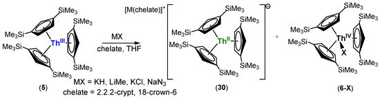 The Th(III) complex (5) becomes disproportionate following its reaction with MX salts (MX = KH, LiMe, KCl, NaN3), in the presence of a chelate ([2.2.2-crypt] or 18-crown-6) to afford the Th(II) complex (30) along with the corresponding Th(IV) complex [ThIV(η5-Cp″)3X](6-X) (Scheme 11) [45]. A plausible mechanism for this reactivity involves the initial formation of [M(chelate)] [ThIII(η5-Cp″)3X] (37), which in the presence of neutral (5), affords the disproportionation products. This mechanism is supported by electrochemical data and the comproportionation reaction between Th(II) complex (30) and [ThIV(η5-Cp″)3Cl] (6-Cl) that yielded (5) as the major product [45].