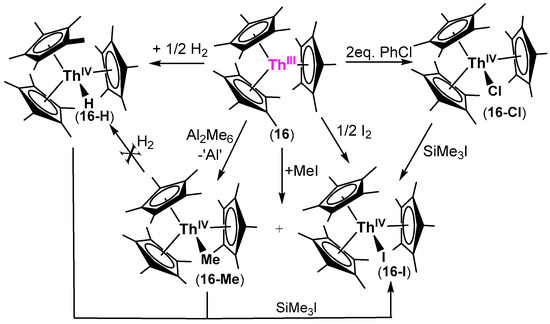Complex (15) does not react appreciably with just H2 before the onset of decomposition, while (5) shows no reactivity at all. In contrast, complex (16) reacts readily with H2 to give the Th(IV) complex [(η5-Cp*)3ThIVH] (16-H) (Scheme 13) [26]. As can be seen from Scheme 13, complex (16) reacts in a manner typical of a reducing complex with various reagents to give sterically crowded Th(IV) products. For example, the Th(IV) methyl complex (16-Me) does not react with H2 to give the hydride complex (16-H).
