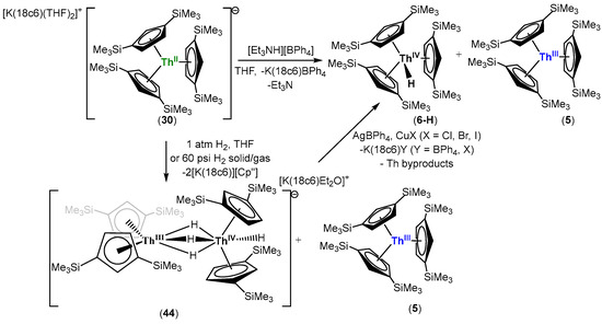 The Th(II) complex [K(18-crown-6)(THF)2][(η5-Cp″)3ThII] (30) reacts with [Et3NH][BPh4] to give the Th(III), complex (5), and the Th(IV), complex [(η5-Cp″)3ThIVH] (6-H) (Scheme 14); as mentioned above, (5) does not react with H2 to give (6-H) in a manner analogous to (16) (Scheme 13). Furthermore, (30) reacts with H2, with concomitant loss of [K(18-crown-6)][Cp″] furnishing again the Th(III) complex (5) and the structurally-characterised mixed-valence Th(IIII)/Th(IV) dimer [K(18-crown-6)Et2O][(η5-Cp″)2ThIII(μ-H)3ThIVH(η5-Cp″)2] (44) (Scheme 14). Complex (44) (and (18)—see Section 2.1—as determined by the analogy of their spectroscopic analyses) is a rare example of a mixed-valence Th(III)/Th(IV) dimer; a spectroscopy and computational analysis advocate a 6d1 configuration with the HOMO and LUMO being localised at the Th(III) metal centre, and having predominantly dz2 metal characteristics. The isolation of (44) signifies that the [Cp″2(μ-H)3]5− ligand set can also provide a suitable coordination environment for this electronic configuration. Complex (44) can be oxidised with AgBPh4 or CuX salts to furnish (6-H). In contrast, its Cp* analogue (18) is oxidised by the same reagents to give the Th(IV) dimeric precursor [{(η5-Cp*)2ThIVH}(μ-H)]2 (17), further demonstrating the role of steric hindrance in the reactivity of these complexes [46].