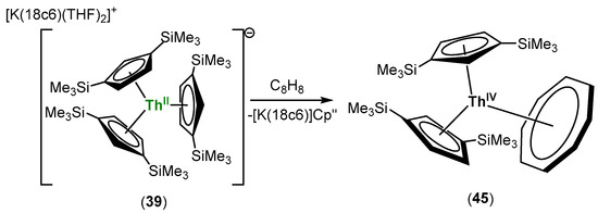 Nevertheless, the observed redox transformations of (30) distinguish Th(II) complexes from their U(II) analogues (see below Section 3.2). A germane example is the reactivity of (30) with COT (C8H8) to yield the Th(IV) complex [ThIV(η5-Cp″)2(η8-C8H8)] (45), i.e., the result of a two electron reductions in COT, as the only thorium containing product (Scheme 15) [46].