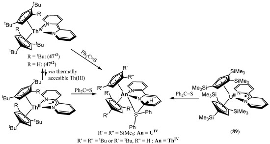 At this point it is also pertinent to mention that the reactivity of the Th(IV) complexes [ThIV(η5-Cpttt)2(2,2′-bipy2−)]/[ThIV(η5-Cptt)2(2,2′-bipy2−)] (46t3/46t2) (Cpttt = {1,2,4-tBu3-C5H2}−) (Scheme 16) with Ph2C=S [50] parallels that of the U(III) complexes [UIII(η5-Cp‴)2(2,2′-bipy−•)](47) (Cp‴ = {1,2,4-(SiMe)3-C5H2}−) with the same substrate or of [UIII(η5-Cp*)2(2,2′-bipy−•)] (48) with p-chloro-benzaldehyde [51,52,53]. Magnetometric studies (SQUID) showed that complexes (46t3/46t2) exhibit small but positive χM’s at H > 1T, displaying temperature independent paramagnetism which is indicative of low-lying excited states coupling to their S = 0 ground state (van Vleck paramagnetism). Computational studies further confirmed this, pointing to an S = 1 triplet excited state (f0d1π*1) which can be thermally populated. The observed product is explained with the reaction taking place along this S = 1 energy surface with the first step being the coordination of Ph2C=S to the Th centre of this triplet state complex [50].
