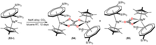 The intermediacy of a transient Th(III) complex has also been suggested in the reductive transformation of CO2 to C2O42− (reductive coupling) or CO32− (reductive disproportionation) by the Th(IV) complex [Th(η8-COTTIPS)(η5-Cp*)I] (53-I) (COTTIPS = [{1,4-(SiiPr3)}2-C8H6]2−) in the presence of an Na/K alloy in toluene over 12 days to furnish the Th(IV) dimeric complexes [{Th(η8-COTTIPS)(η5-Cp*)}2(μ:κ2, κ2 − C2O4] (54) and [{Th(η8-COTTIPS)(η5-Cp*)}2(μ:κ1, κ2 − CO3] (55) (Scheme 17), respectively. The intermediacy of the Th(III) complex [Th(η8-COTTIPS)(η5-Cp*)] (53), analogous to the U(III) mixed sandwich complexes, supported by the [COTSiR3]2− (R = iPr, Me) and [CpMe4R1]− (R1 = H, Me, Et, iPr, tBu, SiMe3) ligands known to facilitate reductive transformations of CO2, was based on the absence of reactivity between [Th(η8-COTTIPS)(η5-Cp*)X] (53-X) (X = Cl, I) and Na2CO3 or Na2C2O4 over prolonged periods of time. Attempts to isolate the Th(III) complex (53) by reducing (53-I) with Na/K alloy under the same reaction conditions invariably led to the formation of Th metal and [ThIV(η8-COTTIPS)2] (56) [54].