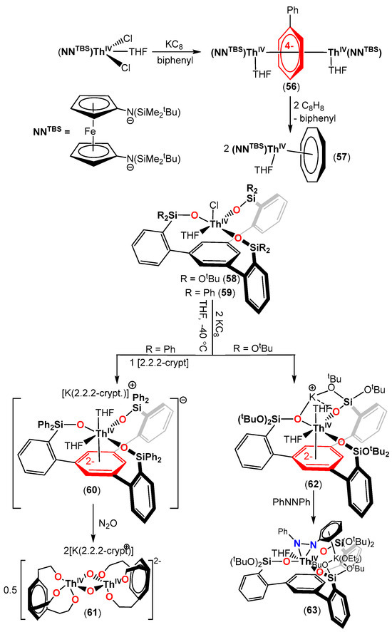 Diaconescu et al. have reported on the synthesis and isolation of a series of bimetallic thorium complexes supported by a di-amido ligand, and featuring an aromatic 10π tetra-anionic μ-η6,η6 arene symmetrically bridging the two metal centres (56) (Scheme 18) [55]. Although these inverse arene sandwich complexes feature Th(IV) metal centres, their reactivity is akin to that of low valent thorium complexes (e.g., the reaction of (56) with COT, Scheme 18).