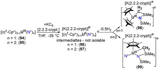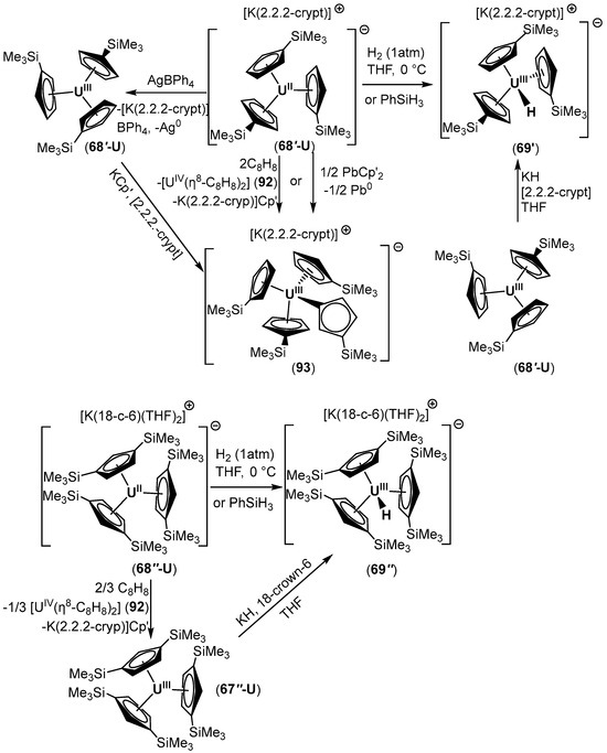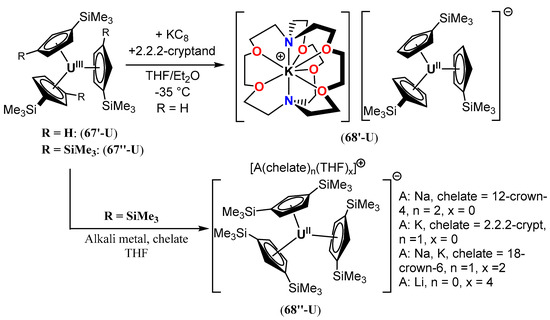 Following their success in accessing the +2 oxidation state for the whole lanthanide series (except Pm) [5,184,185,186,187,188], Evans and co-workers reported the first successful synthesis, isolation and crystallographic characterisation of the dichroic maroon/green U(II) complex [K(2.2.2-cryptand)][UII(η5-Cp′)3] (68′-U) (Cp′ = {SiMe3-C5H4}−), prepared by the reduction in green [UIII(η5-Cp′)3] (67′-U) [58] with KC8 in the presence of the chelate 2.2.2-cryptand in THF/Et2O at −35 °C [38]. Complex (68′-U) is stable at RT in the solid state for several days, but its THF solutions have a t1/2 of ca 1.5 hrs owing to its high reactivity (Scheme 19). In contrast, its analogues (68′-U) supported by the Cp″ (Cp″ = {1,3 − C5H4(SiMe3)2}−) (Scheme 19) ligand are more stable (t1/2 of 15 to 20 hrs in THF) [189]. The increased steric protection and the incorporation of an extra electron withdrawing SiMe3 group per Cp are believed to play some role, but unfortunately, due to the insufficient quality of structural data for (68″-U) the comparison of pertinent metric parameters with (68′-U) is not possible.