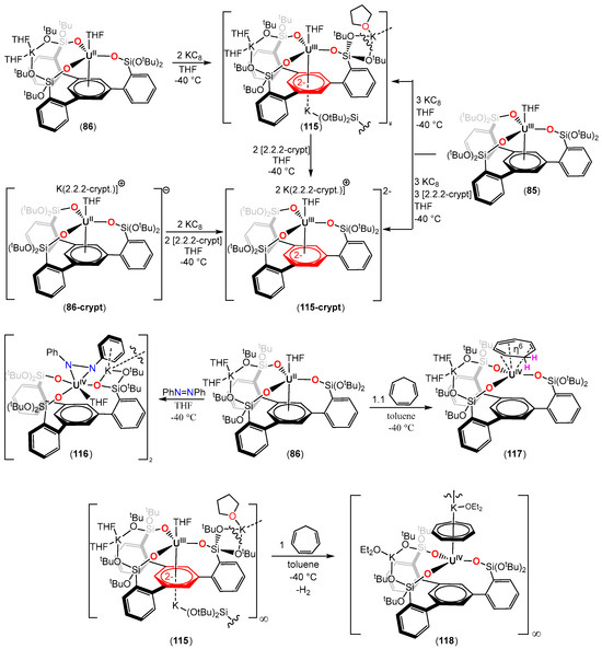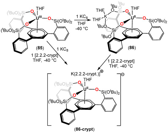 Similarly, the neutral U(II) complex [UII (NHAriPr6)2] (80) [205], as well as the ionic complexes [K(2.2.2-crypt)][UII(κ1-O:η6-TDA)2] (82) (TDA = N-(2,6-di-isopropylphenyl)pivalamido) [206], [K(2.2.2-crypt)][UII (AdTBPN3)] (84-U) [146] and the ate U(II) complex [K(THF)2-UII[{OSi(OtBu)2Ar}3-arene](THF)] (86) as well as its ion separated congener [K(2.2.2-crypt.][UII[{OSi(OtBu)2Ar}3-arene](THF)] (86-crypt) (Scheme 21) [207], all featuring U-η6 arene interactions, exhibit a 5f4 electronic ground state.