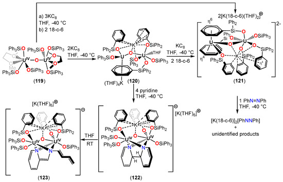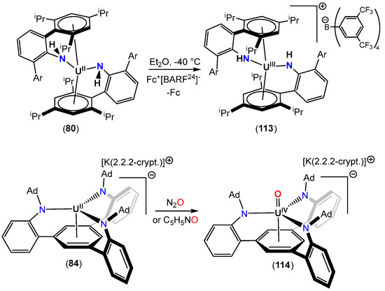 - Arnold, P.L. Uranium-Mediated Activation of Small Molecules. Chem. Commun. 2011, 47, 9005–9010. [Google Scholar] [CrossRef]