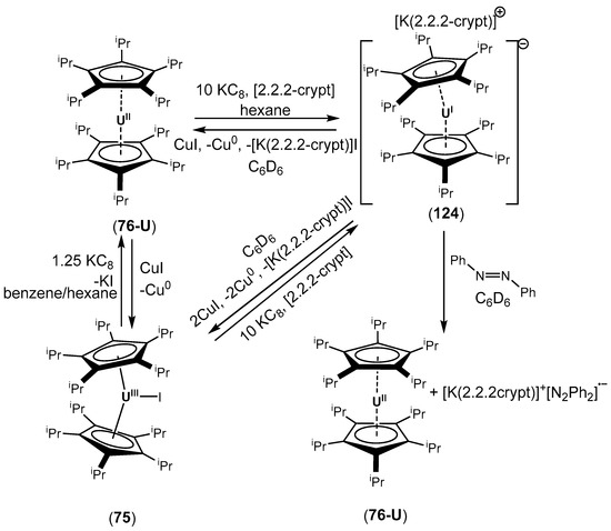 Using the penta-isopropyl substituted Cp, CpiPr5, Layfield et al. were able to access the neutral U(II) complex [UII(η5-CpiPr5)2] (76-U) (Scheme 20) [196]. Complex (76-U) adopts in the solid state the staggered confirmation of the D5d polymorph of ferrocene with a CpiPr5(cent)-U(II)- CpiPr5(cent) angle of 180° and thus can be given the moniker of the ‘2nd generation uranocene’, 51 years after the isolation of [UIV(η8-C8H8)2] (77) [197].