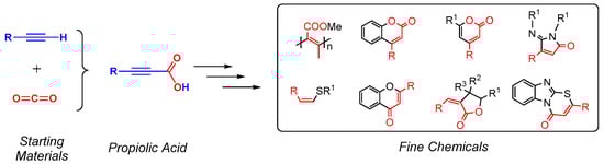 - Chen, C.; Wu, J.; Yan, G.; Huang, D. Recent Advances of Propiolic Acids in Organic Reactions. Tetrahedron Lett. 2020, 61, 151415. [Google Scholar] [CrossRef]