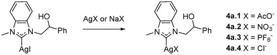 The iodide counterion of complex 4a undergoes exchange when it reacts with the appropriate silver or sodium salt due to the precipitation of silver iodide. Thus, 4a.1, 4a.2, and 4a.3 were obtained using silver acetate, silver hexafluorophosphate, and silver nitrate, respectively (Scheme 4). Chloride complex 4a.4 was obtained by the reaction of 4a with an excess of NaCl. The main evidence of the counterion exchange is due to the shift of the carbenic carbon in the 13C NMR spectra of 4a.1, 4a.2, 4a.3, and 4a.4, whereas the rest of the spectra remain mostly unaltered. Table 1 shows the chemical shifts of these carbon atoms, which are at lower ppm (upfield shifted), as the σ-donor capacity of the NHC decreases [].