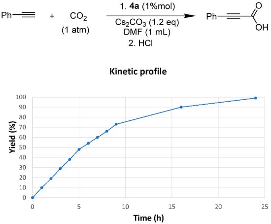 The catalytic activity of complex 4a was evaluated by monitoring the carboxylation reaction of phenylacetylene carried out at room temperature in DMF under a CO2 atmosphere. The kinetic data are reported, and the corresponding kinetic profile is shown in Scheme 5. The conversions/time curve was determined with 1H-NMR spectroscopy using the integration of the signals of the aromatic protons and that of the alkynyl proton of the residual phenylacetylene at δ 3.14 ppm.