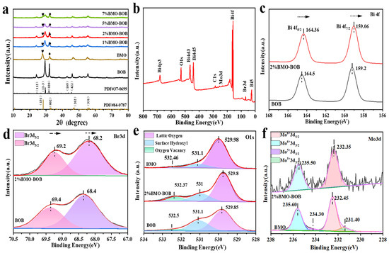 (a) XRD patterns; (b) High-resolution XPS; (c,d) Bi 4f and Br 3d spectra of 2% BMO–BOB and BOB; (e) O1s spectrum of 2% BMO–BOB, BMO, and BOB; (f) Mo6+ and Mo5+ 3d spectra of 2% BMO–BOB and BOB.