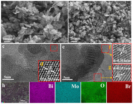 In order to further study and determine the successful synthesis of BMO–BOB composite materials, HRTEM analysis and element mapping images were carried out. As shown in Figure 2c,e, both pure Bi4O5Br2 and the 2% BMO–BOB composite have a clear lattice structure. In Figure 2d,g, the lattice spacing of Bi4O5Br2 is shown to be 0.281 nm, which is consistent with the (11-3) crystal plane spacing. Meanwhile, the lattice spacing in Figure 2f is shown to be 0.314 nm, which matches the (131) crystal plane of Bi2MoO6. In addition, the element mapping analysis was carried out, shown in Figure 2h. The results indicate the elements of Bi, Mo, O, and Br were uniformly dispersed on the surface of 2% BMO–BOB. These results further confirmed the successful synthesis of BMO–BOB composites.