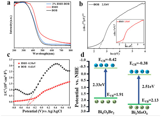 The optical properties of the catalyst can reflect its photocatalytic performance. Figure 3a shows the optical properties of BOB, BMO, and 2% BMO–BOB samples. The band gap of pure BOB and BMO were calculated by the Tauc method, following the equation (αhν) = A(hν − Eg) n/2, where α, ν, Eg, and A represents absorption coefficient, light frequency, band gap, and a constant, respectively. For Bi2MoO6, which is a direct band gap, n = 1 [51]. For Bi4O5Br2, which is an indirect band gap, n = 4 [52]. The Eg values are shown to be 2.51 and 2.33 eV for BMO and BOB in Figure 3b, respectively. The flat band potential (Efb) of the material was measured by the electrochemical test method and recorded in the Mott–Schottky diagram. As shown in Figure 3c, the flat band potentials (Efb) of Bi4O5Br2 and Bi2MoO6 are −0.42 eV and −0.38 eV (vs. Ag/AgCl), respectively. For n-type semiconductors, the CB position is minus 0.1~0.2 eV compared to the flat band potential [53]. Therefore, the CB of pure Bi4O5Br2 and Bi2MoO6 are −0.62 and −0.58 eV, respectively (vs. Ag/AgCl). According to ENHE = EAg/AgCl + E0Ag/AgCl; E0Ag/AgCl = 0.1976V vs. NHE (25 °C) [54], the CB of pure Bi4O5Br2 and Bi2MoO6 are about −0.42 and −0.38 eV, respectively (vs. NHE). The EVB is calculated by Eg and ECB (EVB = Eg + ECB), as shown in Figure 3d, the EVB of Bi4O5Br2 and Bi2MoO6 are 1.91 eV and 2.13 eV, respectively.