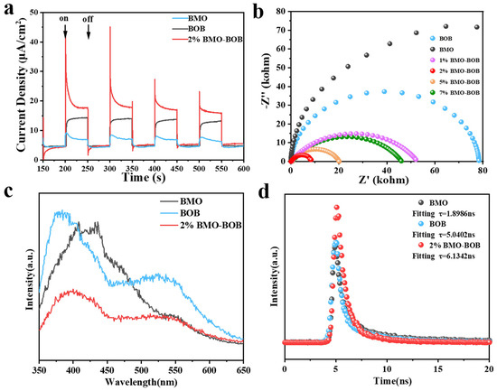 (a) Transient photocurrent response test of BMO, BOB, and 2% BMO–BOB; (b) Impedance test of the sample; (c) The steady-state fluorescence spectra; and (d) time-resolved transient fluorescence spectra of BMO, BOB, and 2% BMO–BOB.