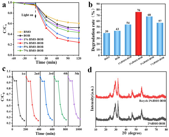 In this study, the photocatalytic degradation of tetracycline over different catalysts is used to evaluate the performance of the catalyst. As shown in Figure 5a, the catalyst reaches adsorption and desorption equilibrium within one hour under dark conditions. Under two hours of illumination, the degradation effect of BMO–BOB composite catalysts was better than that of single catalyst. The degradation effect of 2% BMO–BOB was the best, with a degradation rate of 76% (Figure 5b). The 5% BMO–BOB catalyst was followed by it, and the degradation rate reached 68%, which was consistent with the results of photoelectrochemical analysis. This is because the photogenerated carriers are efficiently separated and quickly transferred. In order to study the stability of the catalyst, cycle experiments were carried out to evaluate the performance of 2% BMO–BOB. As shown in Figure 5c, the performance of the catalyst only decreased by 3% after five cycles of experiments. Furthermore, the recycled 2% BMO–BOB catalyst was characterized by XRD, as shown in Figure 5d. The XRD analysis indicates that the recycled catalyst maintains the same crystal structure as the original material, underscoring the stability of the catalyst. The effects of pH value and temperature on the photocatalytic degradation of tetracycline were investigated. As shown in Figure S1, the TC degradation efficiency of 2% BMO–BOB reached 78%, 79%, 76%, 74%, and 59%, respectively, across different pH (3, 5, 7, 9, 11) conditions. Therefore, the 2% BMO–BOB catalyst maintains a high degradation efficiency under acidic to mildly alkaline environments. As the reaction temperature rose from 15 °C to 25 °C in Figure S2, the degradation rate increased by 3%. Further increasing the temperature from 25 °C to 35 °C, the degradation rate was stable (76.4%). Thus, the 2% BMO–BOB photocatalyst shows good activity, stability, and adaptability in the photocatalytic degradation of tetracycline.