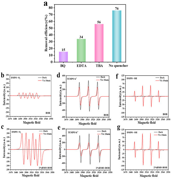 (a) Free radical capture experiment; (b–g) The ESR spectra of BOB and 2% BMO–BOB; (b,c) ·O2− spectra of BOB and 2% BMO–BOB; (d,e) h+ spectra of BOB and 2% BMO–BOB; (f,g) ·OH spectra of BOB and 2% BMO–BOB.