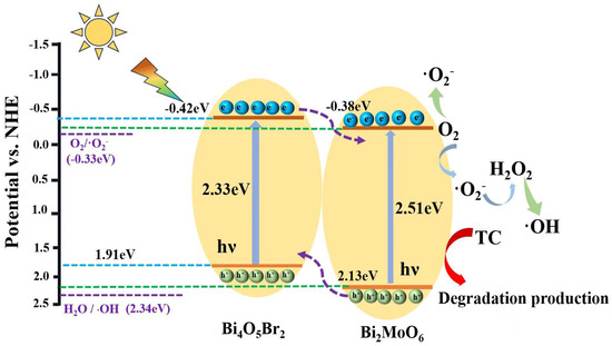 Based on the above results, a possible type II approach was adopted to explain the charge separation and transfer process on the 2% BMO–BOB heterojunction, as shown in Figure 7. Under visible light irradiation, electrons of both Bi4O5Br2 and Bi2MoO6 are excited from VB to CB. The CB potential of Bi4O5Br2 (−0.42 eV) is more negative than that of Bi2MoO6 (−0.38 eV), while the VB of Bi2MoO6 (2.13 eV) is more positive than that of Bi4O5Br2 (1.91 eV). Bi4O5Br2 and Bi2MoO6 are in close contact to construct a heterojunction; photogenerated electrons can be transferred from Bi4O5Br2 to the CB of the Bi2MoO6. Meanwhile, photogenerated holes can be transferred from Bi2MoO6 to the VB of the Bi4O5Br2. Therefore, the effective separation of holes and electrons can be realized. The photoexcited h+ in the VB of Bi4O5Br2 can directly participate in the oxidative degradation of TC. Electrons on the CB of Bi2MoO6 have a more negative reduction potential than the O2/·O2− (−0.33 eV) potential, which can effectively generate active ·O2− by reacting with dissolved O2 in the solution. In addition, since the VB potential is lower than H2O/·OH (2.34 eV), it is difficult to generate ·OH radicals by direct oxidation of H2O. Instead, the photoexcitation of e− induced O2 to produce ·O2−, which was further converted into H2O2 and subsequently into ·OH radicals. [60,61]. The ESR spectrum of DMPO–·OH also confirmed the formation of ·OH. In summary, ·O2− and photogenerated h+ are considered to be the key active species to promote TC degradation and the ·OH radical-assisted oxidation reaction. These discussions are in good agreement with the results of free radical trapping experiments. The 2% BMO–BOB type II heterojunction achieves a higher separation rate of the photogenerated electron-hole pairs, allowing for more efficient utilization of photogenerated carriers in the degradation process. Thus, the reaction rate of tetracycline degradation was accelerated.