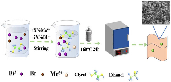The agents used in the synthesis of the photocatalysts include: Bismuth nitrate pentahydrate (Bi(NO3)3·5H2O), potassium bromide (KBr), Sodium molybdate (Na2MoO4·2H2O), ethylene glycol (CH2OH)2, sodium hydroxide (NaOH), and ethanol (C2H6O) are analytically pure and purchased from Sinopharm Chemical Reagent Co., Ltd. (Shanghai, China). Tetracycline was purchased from Dalian Ronghai Biotechnology Co., Ltd. (Dalian, China). Solutions were prepared with deionized water.