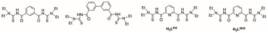 - Nguyen, H.H.; Jegathesh, J.J.; Takiden, A.; Hauenstein, D.; Pham, C.T.; Le, C.D.; Abram, U. 2,6-Dipicolinoylbis(N,N-dialkylthioureas) as versatile building blocks for oligo- and polynuclear architectures. Dalton Trans. 2016, 45, 10771–10779. [Google Scholar] [CrossRef]