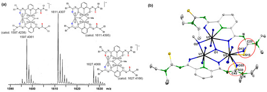 The intermediate coordination of sulfur atoms plays a role during the formation of the {L2Et2}2– complexes of the present study. Spectroscopic and/or crystallographic evidence for such intermediate species has been found during the inspection of the reaction mixtures and/or by quenching the reaction after a few minutes by the precipitation of the product(s). An example is shown in Figure 4. It contains (a) an ESI(–) mass spectrum taken after 5 min from a reaction mixture between (EtPPh3)2[{UO2(LEt2)(µ2-OMe)}2] and NEt3 in aqueous MeOH (see Scheme 2a) and (b) the result of an X-ray structure analysis taken from the material of such an (unfinished) reaction. The mass spectrum shows peaks at m/z = 1597.4153 ([(UO2)3(L2Et2)2(µ2-OH)(µ3-O)]–, exchange product with water), m/z = 1611.4307 [(UO2)3(L2Et2)2(µ2-OMe)(µ3-O)]–, molecular ion of the product), and m/z = 1627.4068, which can be assigned to an anion of the composition [(UO2)3(L2Et2)(LEt2)(µ2-OMe)(µ3-O)]– (calcd. 1627.4068). Since mass spectrometry gives no direct information about the bonding situation inside the detected ions, the presence of a still-intact {LEt2}2– ligand is not direct proof of the coordination of this ligand to uranium via a sulfur atom. Final evidence for this bonding mode, however, can be derived from a crystal structure determination on mixed (EtPPh3)[(UO2)3(L2Et2)2(µ2-OMe)(µ3-O)]/(EtPPh3)[(UO2)3(L2Et2)(LEt2)(µ2-OMe)(µ3-O)] crystals. They were isolated by the precipitation of the product(s) from an incomplete reaction and contain approximately 10 percent of the complex with the sulfur-coordinated ligand {LEt2}2–. This can be derived from a corresponding refinement of the structural data, which results in thermal ellipsoids of reasonable quality, as can be seen in Figure 4b. The structure is very similar to that shown in Figure 3c, with the remarkable difference that the corresponding U–S and C–S bond lengths can be derived (U3–S13 2.583(17) Å, U3–O13 2.340(5) Å, C23–S13 1.709(18) Å, C23–O13 1.269(7) Å, U3–S33 2.568(18) Å, U3–O33 2.330(5), C43–S33 1.709(18) Å, C43–O33 1.261(8) Å).