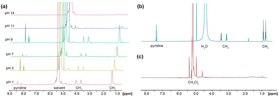 (a) 1H NMR spectra recorded from the organic phase during the treatment of H2LEt2 in a CH2Cl2/H2O mixture at different pH values indicating an ongoing extraction into the aqueous phase at pH values > 9, (b) spectrum of the aqueous phases at pH 14 showing the presence of intact, deprotonated {LEt2}2–, and (c) the spectrum of the (almost empty) CH2Cl2 phase under the same conditions.