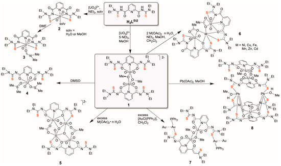 During the reactions of uranyl compounds with H2LEt2, it became evident that the nature of the isolated products is strongly dependent on the reaction conditions. In particular, the amount of supporting base was crucial for the composition of the obtained solids. The labile, binuclear compound 1 plays a central role in such reactions. The methanolato bridges of this complex easily dissociate from uranium in solution and the resulting monomers form solvent complexes such as complex 4, rearrange to oligomeric compounds such as compound 5, or give bimetallic complexes (6 to 8), depending on the conditions applied. The sulfur atoms of the {LEt2}2– ligands remain uncoordinated in most of the products or establish coordinative bonds to accompanying “soft” metal ions. An interesting reaction feature was found during the synthesis of the tetrameric compound 5, in which two sulfur atoms bind to uranium. A careful inspection of the obtained single crystal X-ray structure showed that the thermal ellipsoids of the coordinated “sulfur atoms” were too large to justify a complete occupation with sulfur. Best results were obtained under the assumption that approximately 10 percent of these positions are occupied by oxygen [43]. This finding points to a (partial) hydrolysis of one of the thiourea functionalities upon prolonged reaction times in the presence of an excess of base, likely influenced by the metal ion. As a result, the non-symmetric ligand {L2Et2}2− of Figure 1 has been formed. Stimulated by this unexpected result, we conducted ongoing reactions between compound 1 or other uranyl starting materials with H2LEt2 using various amounts of the supporting base NEt3.