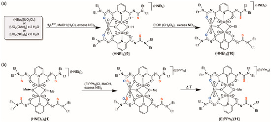 While reactions of common uranyl starting materials such as uranyl nitrate, uranyl acetate, or (NBu4)2[UO2Cl4] with H2LEt2, and a slight excess (typically 5 equivalents) of triethylamin as a supporting base in methanol, give the dimeric, methanolato-bridged anion [{UO2(LEt2)(µ2-OMe)}2]2− (1) in good yields [42,43], similar reactions with a large excess of NEt3 (25 equivalents or more) result in the hydrolysis of two of the thiourea units and the formation of trimeric complexes of the composition [(UO2)3(L2Et2)2(µ2-OR)(µ3-O)]− (9–11). The connections between the uranium atoms are established by the carbonyl functionalities of the {L2Et2}2– ligands, a central µ3-bonded oxido ligand, and an OR– unit, where the residue R represents H, Me, or Et depending on the synthetic route (see Scheme 2).