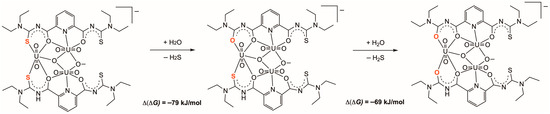 Calculations on the hypothetical, step-wise, gas-phase reaction between [(UO2)3(LEt2)2(µ2-Me)(µ3-O)]− with one equivalent of H2O to give [(UO2)3(L2Et2)(LEt2)(µ2-OMe)(µ3-O)]− and H2S followed by the reaction with another equivalent of H2O to give [(UO2)3(L2Et2)2(µ2-OH)(µ3-O)]− and a second equivalent of H2S were performed on the B3LYP/LANL2DZ(uranium)+6-311++G**(others) level in vacuum. There is a clear thermochemical preference for the uranium complexes containing the hydrolyzed ligand(s) in their coordination spheres (Scheme 3). The release of a free energy ∆(∆G) of approximately 70–80 kJ/mol per hydrolysis step is in accordance with the observed reactivity and product distribution observed in the conducted experiments.
