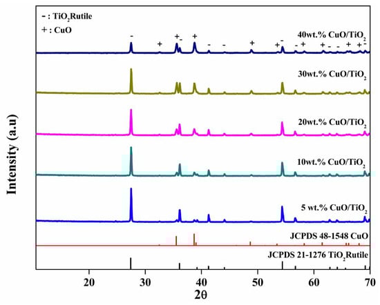 The XRD patterns of the CuO/TiO2 catalyst series are presented in Figure 1. The results obtained reveal that the materials are primarily composed of the rutile phase of TiO2 in accordance with ICDD 21-1276. The presence of CuO in its monoclinic form was also verified in accordance with the ICDD 48-1548 reference pattern, confirming the effective loading of copper oxide in TiO2. Figure 1 also reveals a correlation between the deposited quantity of Cu(II) ions and the intensities of the characteristic CuO peaks. These findings collectively indicate the successful preparation of the CuO/TiO2 catalysts with varying percentages of CuO deposition. The average crystallite size of CuO was determined to be 26, 27, 32, 35, 36 nm for 40, 30, 20, 10 and 5 wt.% CuO/TiO2 catalysts, respectively. The crystallite size was determined using the Scherrer equation [37]: