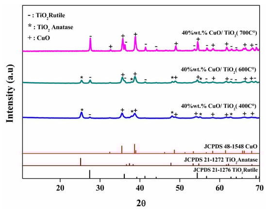 XRD patterns of 40 wt.% CuO/TiO2 samples calcined at different temperatures.