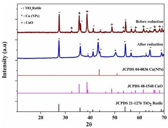 XRD patterns of 40 wt.% CuO/TiO2 before and after the reduction experiment.