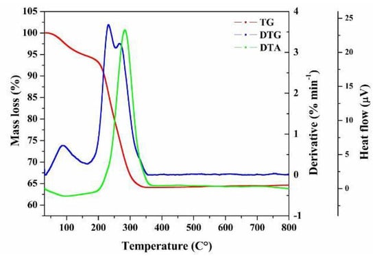 To examine the thermal behavior of CuO/TiO2, thermal experiments involving thermogravimetric and differential measurements were performed. The results are shown in Figure 4. The initial step, characterized by a weight loss of 3% within the temperature range of 30 to 150 °C, can be attributed to the vaporization of water [39]. The notable weight reduction occurring between 200 and 350 °C, as evaluated at 30%, appears to be associated with the decomposition and combustion of the organic constituents. The latter was confirmed by an intense exothermic peak observed in the DTA curve and two intense peaks in the DTG curve [40]. On the other hand, no weight loss was observed at temperatures above 450 °C, and the anatase to rutile phase transition that should occur above 600 °C [38] was not observed in the DTA curve because of its reduced sensitivity compared with that of differential scanning calorimetry (DSC).