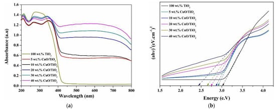 (a) UV–vis diffuse reflectance spectra of TiO2 and wt.% CuO/TiO2 and (b) Tauc plot.