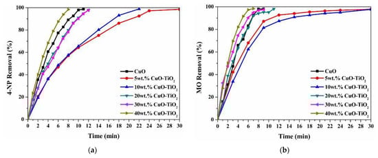 Reduction performance of the wt.% CuO/TiO2 catalysts for 4-NP (a) and MO (b).
