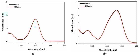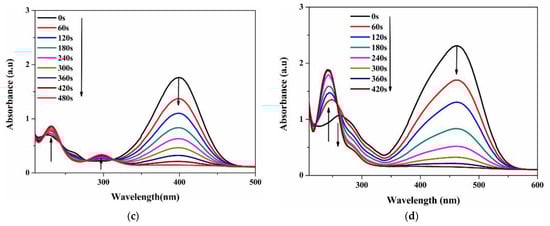 Figure 11a,b display the absorption spectra of 4-NP and MO in the presence of NaBH₄ but without the use of a catalyst. Under these conditions, the peak intensities show little change even after 180 min, indicating a negligible reduction rate, as no significant degradation occurred during this time. However, when CuO/TiO2 is introduced alongside NaBH₄ (Figure 11c,d) and forming Cu(NPs)/TiO2, a rapid and noticeable reduction in the characteristic absorption peaks of both 4-NP and MO is observed. For 4-NP, the peak at ~400 nm diminished progressively, vanishing completely within 480 s (Figure 11c). Similarly, the absorption peak of MO at approximately 464 nm disappears within 420 s (Figure 11d). This demonstrates a much faster and more efficient reduction process in the presence of the CuO/TiO2 catalyst than in the presence of NaBH₄ alone. Simultaneously, a pair of new peaks emerged at 297 nm and 231 nm for the reduction of 4-NP and at 242 nm during the reduction of MO. These new peaks can be attributed to the characteristic absorption bands of the colorless 4-aminophenol (4-AP) from 4-NP and sulfanilic acid along with dimentyl-4-phenylenediamine from OM [45,46].