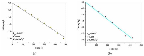 First-order plot for the catalytic reduction of (a) 4-NP and (b) MO. Experimental conditions: 40 wt.% CuO/TiO2 dose = 0.04 g/L, [NaBH4] = 14 mM, and [4-NP or MO] = 0.35 mM.