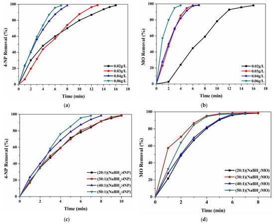 Pollutant removal versus time plots for catalytic reduction using 40 wt.% CuO/TiO2, showing the effect of catalyst dose on the reduction of (a) 4-NP and (b) MO, and the effect of NaBH4 concentration on the reduction of (c) 4-NP and (d) MO.