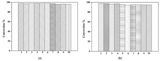 Recycling of CuO/TiO2 in the hydrogenation of (a) 4-NP and (b) MO.