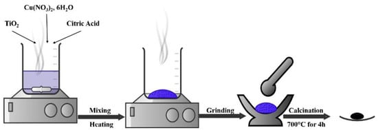 The combustion technique was used to prepare different percentages of wt.% CuO/TiO2 (wt = 5, 10, 20, 30, and 40%). Analytical grade Cu(NO3)2·6H2O (Sigma Aldrich, ≥99.9%), along with TiO2-P25 (Degussa Aeroxide P25) and citric acid as a fuel (Sigma Aldrich, ≥99.5%), served as the starting materials. Initially, these materials were added to deionized water with a fixed weight percentage of metal on TiO2 and an excess amount of citric acid. The resulting mixtures were then stirred to achieve a well-dispersed suspension. The suspension subsequently underwent evaporation from 80 to 130 °C to yield a thick gel. This gel was subsequently converted into a dry form. Finally, the dry gel was calcined in an air atmosphere at 700 °C for 4 h with a ramp rate of 10 °C/min. Figure 16 represents the synthesis method for the catalysts.
