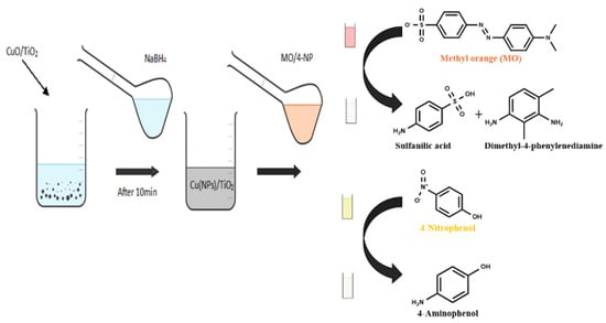 The catalytic activity of CuO/TiO2 was evaluated by studying the reduction of MO (Sigma Aldrich, ≥98.0%) and 4-nitrophenylphenol (Sigma Aldrich, ≥99.0%) as the target pollutants for the experiments. The experimental setup involved a beaker (50 mL) placed at room temperature. The catalytic reaction proceeded as follows: 2 mg of CuO/TiO2 was uniformly dispersed in 35 mL of deionized water, followed by the addition of 10 mL of freshly prepared aqueous NaBH4 (Sigma Aldrich, ≥99.0%) (70 mM). The solution was sonicated for 10 min, resulting in a color change from a black CuO/TiO2 suspension to a gray color, indicating the formation of Cu(NPs)/TiO2. Next, 5 mL of MO (3.5 mM) or 4-NP (3.5 mM) was added to the mixture. The overall concentrations of the organic dyes and NaBH4 were 0.35 mM and 14 mM, respectively. The progress of the reaction was monitored by recording the time-dependent UV–vis absorption spectra of the reaction mixture in the wavelength range between 210 and 600 nm via a spectrophotometer (Techcomp UV 2300). The catalytic reduction experiment is shown in Figure 17.