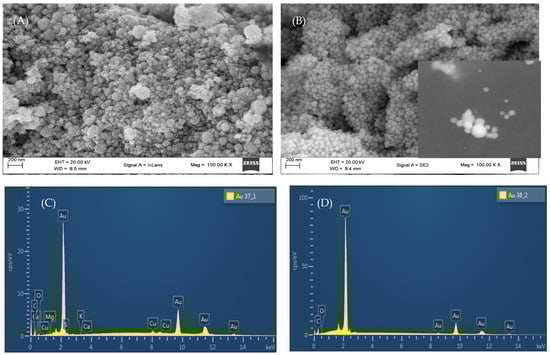 The EDX measurements unambiguously confirmed the presence of metallic Au in all samples measured. The EDX profile shows a strong Au signal, along with C, O, Al, K, and Ca peaks from the biomolecules on the surface of the AuNPs (Figure 3C,D). These elements may also be present due to the elemental composition of the extracts, from which the AuNPs were not completely purified [34]. The grid on which the samples were examined caused Cu’s presence. Thus, all measurement techniques confirmed the presence of AuNPs and NFs. Likewise, the EDX profile of the CuNPs shows strong elemental signals of copper, confirming the presence of CuNPs, as shown in Figure 4C,D. The weight percentages of different elements in the CuNPs were below 10%, as shown in Figure 4C,D. The remaining Wt % was carbon and oxygen present in organic molecules, which act as capping molecules surrounding the nanoparticles, as well as the tape used to mount the CuNPs [35].