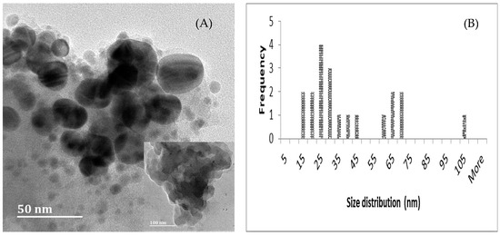 Figure 6A shows the TEM images of spherical CuNPs from all plant parts and their respective solvents, with particle sizes of 20–104 nm (Figure 6B). In Figure 6A and the inset, NPs are similarly sintered, as observed in Section 2.2. The authors suggest that the large sizes of the CuNPs observed in the present study may be due to the concentration and ability of the biomolecules in the extracts to reduce the volume of the CuSO4. Similarly, in a study by Amjad et al., copper nanoparticle size increased with smaller concentrations of the precursor salt [49].